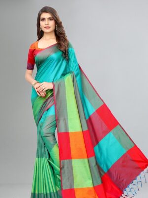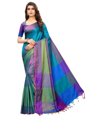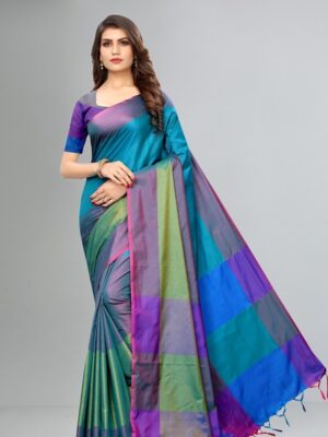 Generic Women’s Cotton Silk Saree With Blouse (Turquoise Blue, 5-6mtrs)
